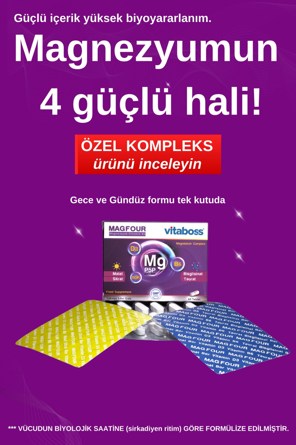 MAGFOUR, 4 farklı magnezyum formunu içerir ve biyolojik saate uygun gündüz & gece formu ile üretilmiştir. Bu özellik onu diğer standart magnezyum ürünlerinden ayırır.